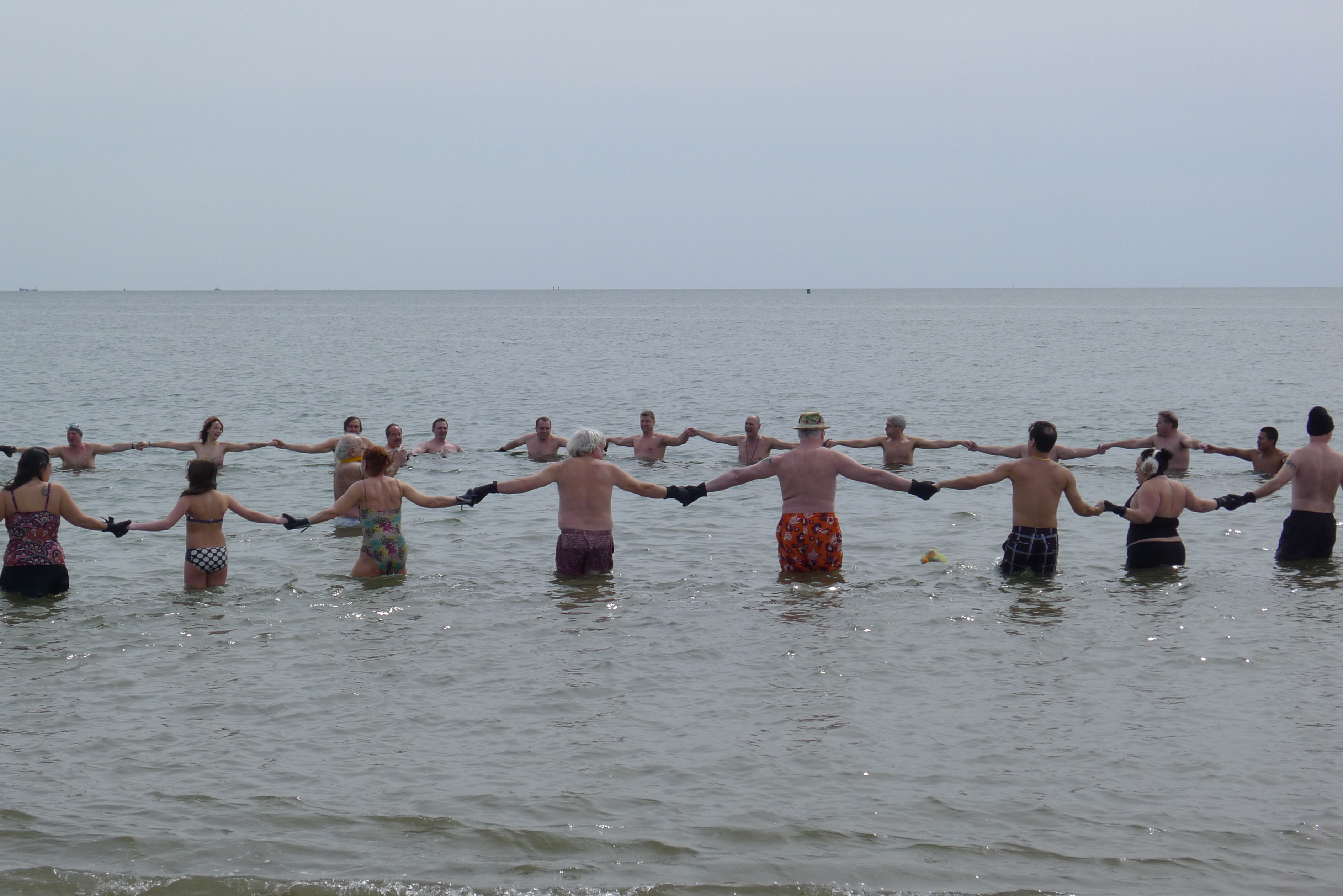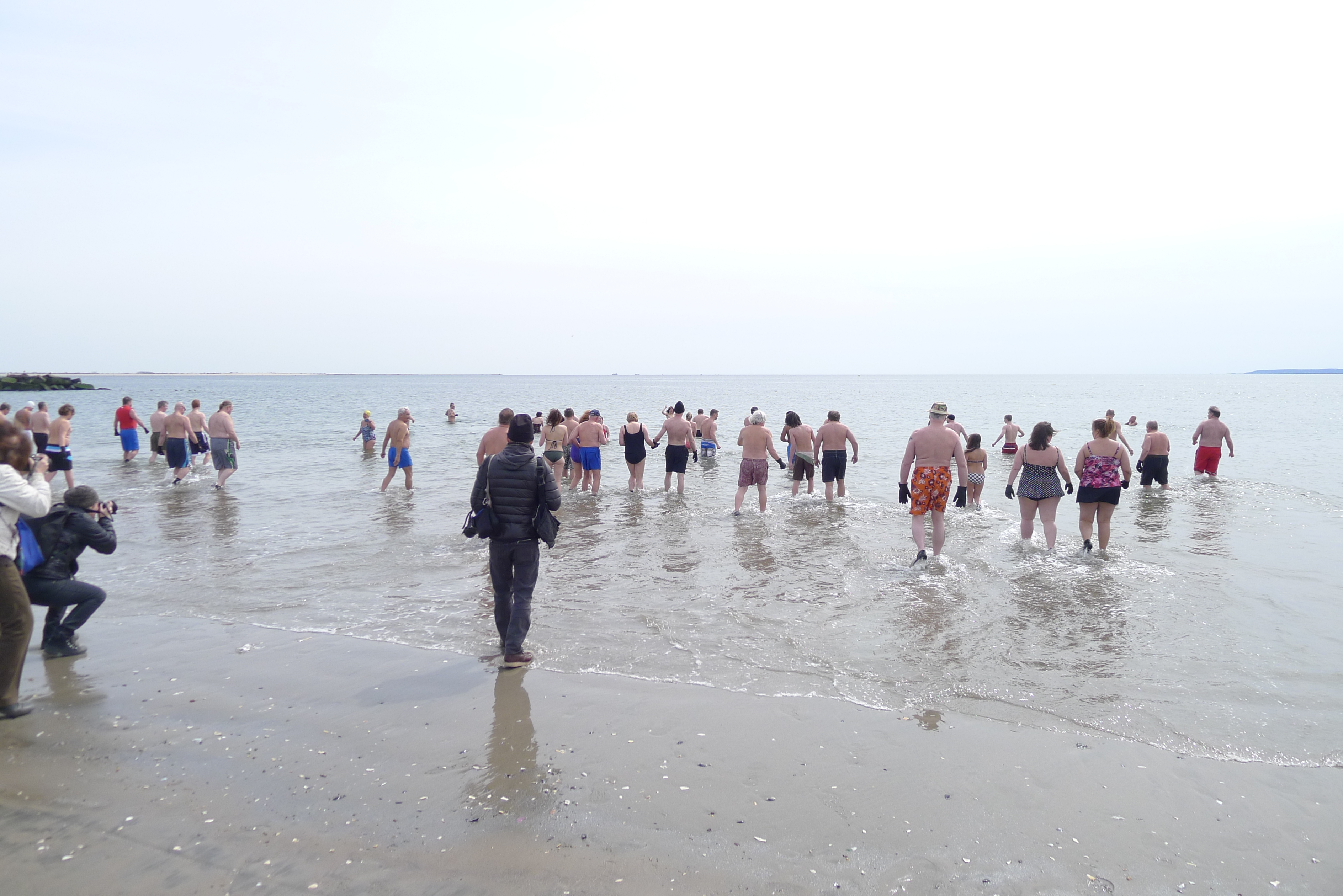 Suddenly the parade was over and Judah Friedlander of 30 Rock was addressing the judges with a pep-talk. “I’m having a sex party right after this!” he proclaimed. “Just follow the smell of awesome!” Then he used a pair of scissors the size of a post-hole digger to cut through 4 ribbons and lead us all across the beach into the ocean for the First Swim of the Summer. Joyce was fully dressed and I was, of course, wearing my lady gaga yellow ankle-length swim-pants as we ran into the waves. I really like to swim. Maybe next year, I’ll be a mermaid in the parade too.