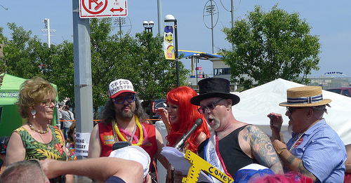 So let me explain this Judges thing. We had each paid $150 for the privilege to Judge the parade. This qualified us for shaded bleacher seats, free beer and water, a couple of dedicated sanicans, a tshirt, and “bribes.” I was curious what other people besides us would want to pay so much to be a judge, and I was about to find out: people who are fanatically protective of their seat. With 4 of us, arriving a bit early, I expected we could sit in pairs on the bleachers. Not so! The people who had arrived earlier were completely uncooperative. First, they were large. I’m sure they were on average each taking up more than one seat. Second, they would not scoot together. They apparently did not want to touch each other any more than I wanted to touch them. Third, they would not scoot down one seat, to allow 2 seats at opposite ends of the bench to be merged together. The complained that they had arrived early to sit with their friends and were not interested in moving over.